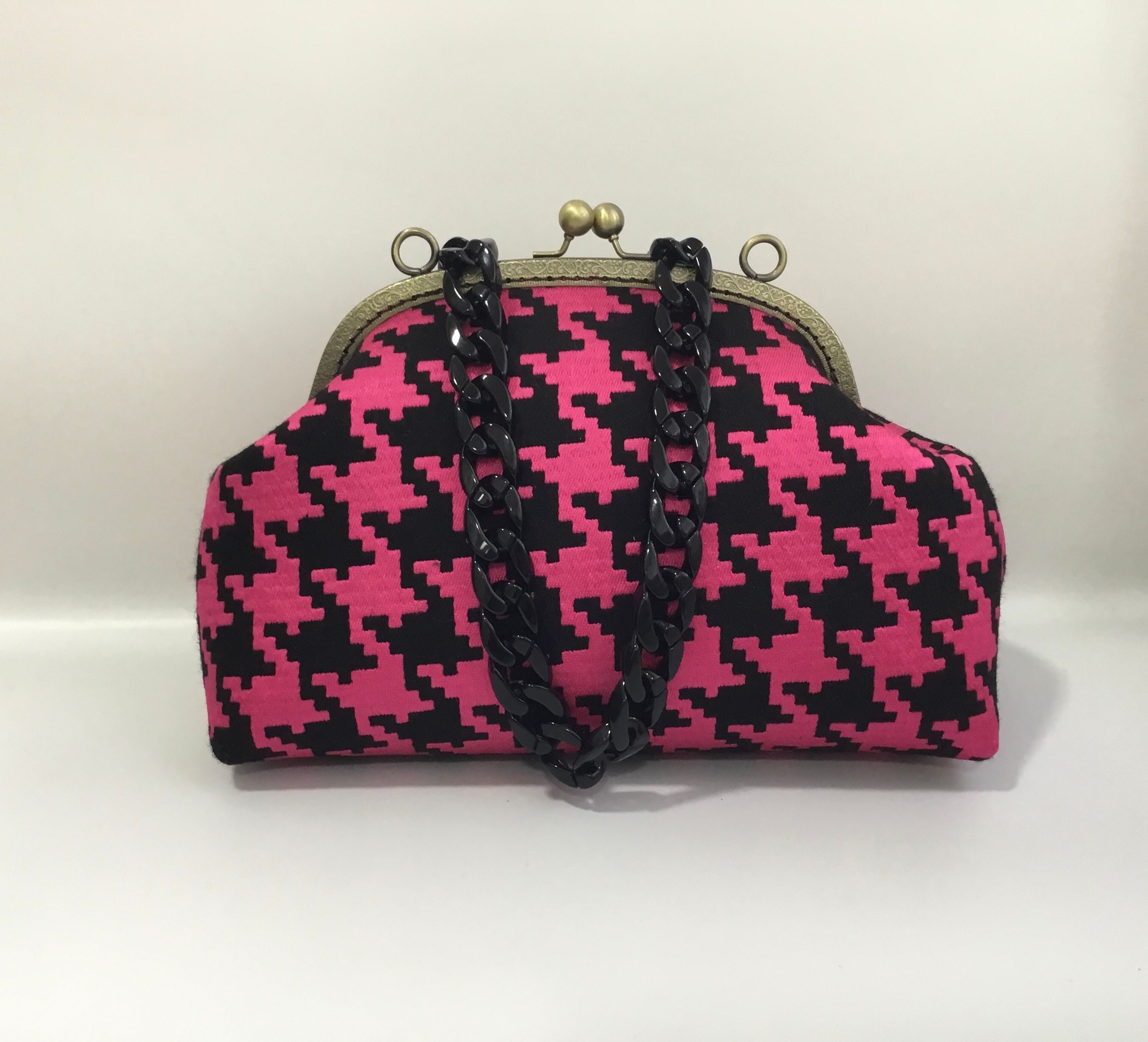 Bolso de pata de gallo fucsia y negra hecho a mano. Boquilla metálica cosida a mano. Correa de resina de color negro. Forro de color negro con dos bolsillos, uno de ellos con cremallera.