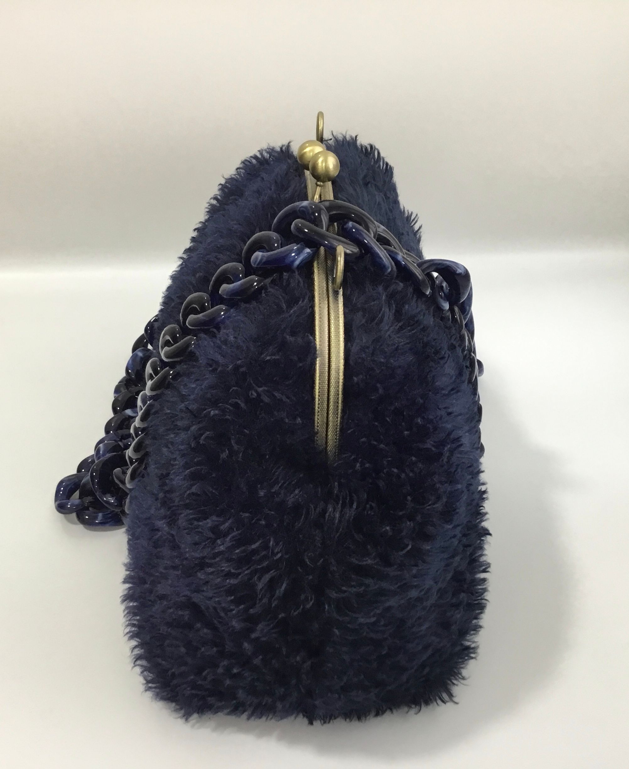 Bolso hecho a mano de pelo sintético llamado "pelo de caniche". Boquilla metálica cosida a mano con cadena de resina de color azul. Forro de color naranja con dos bolsillos, uno de ellos con cremallera.
